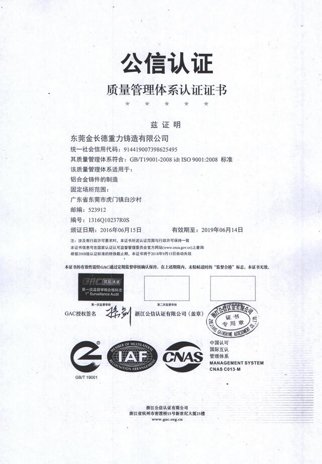 東莞金長德重力鑄造有限公司始建于1990年,是一家專業從事鋁合金重力鑄造、低壓鑄造、砂型鑄造的企業。位于廣東省東莞市虎門鎮白沙一村,已經有三十多年的歷史,專業從事于鋁合金鑄件的生產和加工。我司除了自己設計制作各種鑄造類模具外,鑄造和機械加工為一體是我公司的另外一個生產特色。我們可以根據客戶的要求,來樣,來圖進行模具的設計和產品的生產,做出各種毛胚件和成品件。還有自動射芯機,拋丸機,噴砂機,熱處理機器多臺,CNC數控加工中心,銑床等設備。 我司的產品領域包括了新能源電機、機器人零件、汽摩配件,火車零件,機械零件,馬達風機,空壓機系列,印刷機械零件,木工和醫(yī)療器械零件等類型,產品出口到意大利,法國,美國,英國,以色列,日本,臺灣等國家和地區,深受國內外客戶的認可和好評。